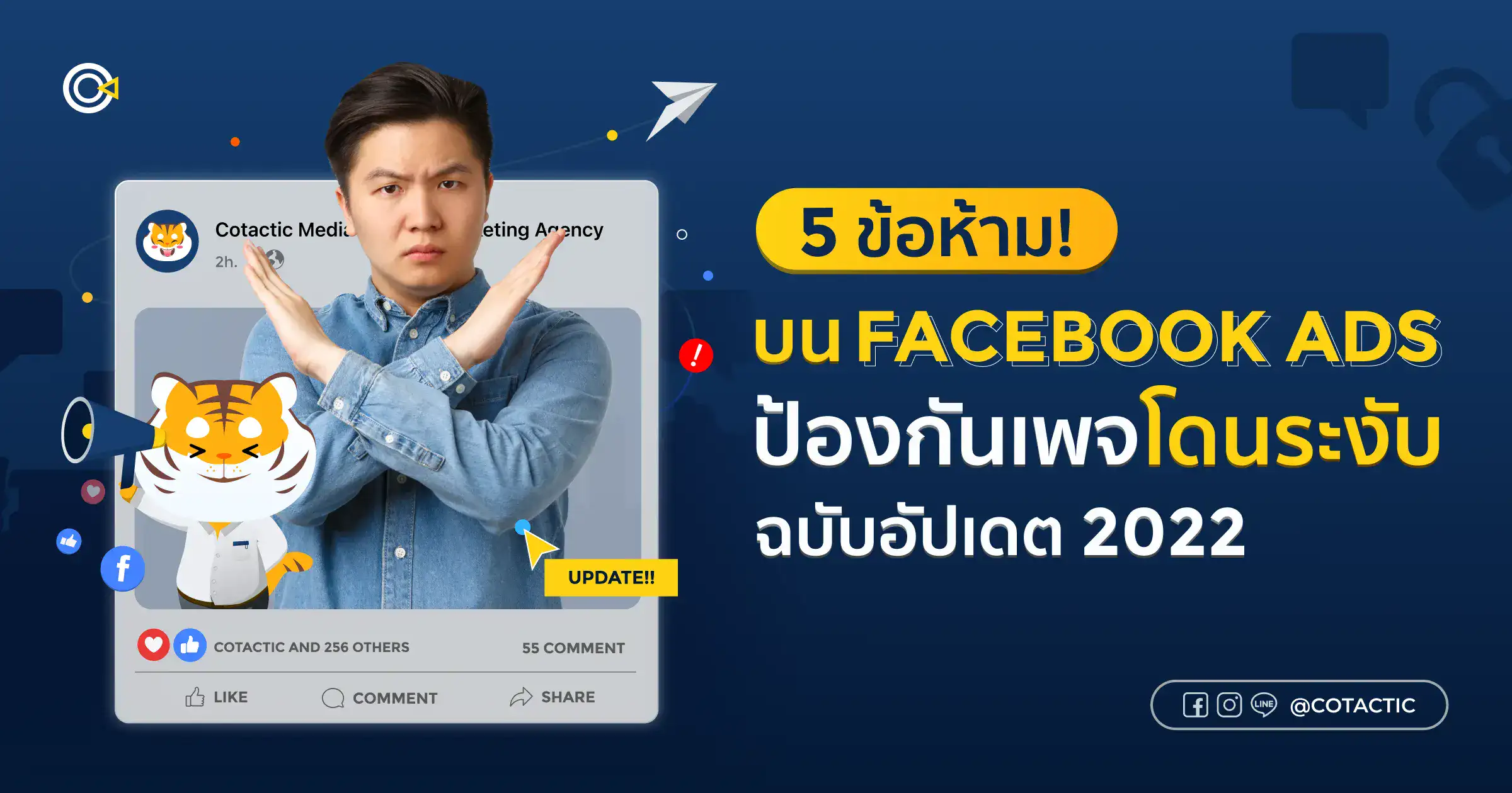 Facebook Ads คืออะไรคือ การซื้อโฆษณาเพื่อโปรโมทสินค้าและบริการบน Facebook โดยสามารถกำหนดกลุ่มเป้าหมายของผู้รับโฆษณา เช่น เพศ อายุ การศึกษา ที่อยู่ ไลฟ์สไตล์ หรือแม้กระทั่งชื่อแบรนด์ของอุปกรณ์สื่อสารที่ใช้ ให้ตรงกับกลุ่มลูกค้าที่วางแผนไว้ได้ อย่างไรก็ดี Facebook จะกำหนดนโยบายการโฆษณา เพื่อป้องกันเนื้อหาที่ละเมิดกฎชุมชน ละเมิดลิขสิทธิ์ หรือส่งเสริมสิ่งที่เป็นอันตรายต่อสังคม และนี่คือสรุป 5 ข้อห้ามจากนโยบายการสร้างโฆษณาใน Facebook ที่คนทำ Digital Marketing ควรรู้ เพื่อป้องกันเพจโดนระงับ หรือในกรณีร้ายแรง คือบัญชีโฆษณาถูกปิด จะมีอะไรบ้าง ไปดูกัน